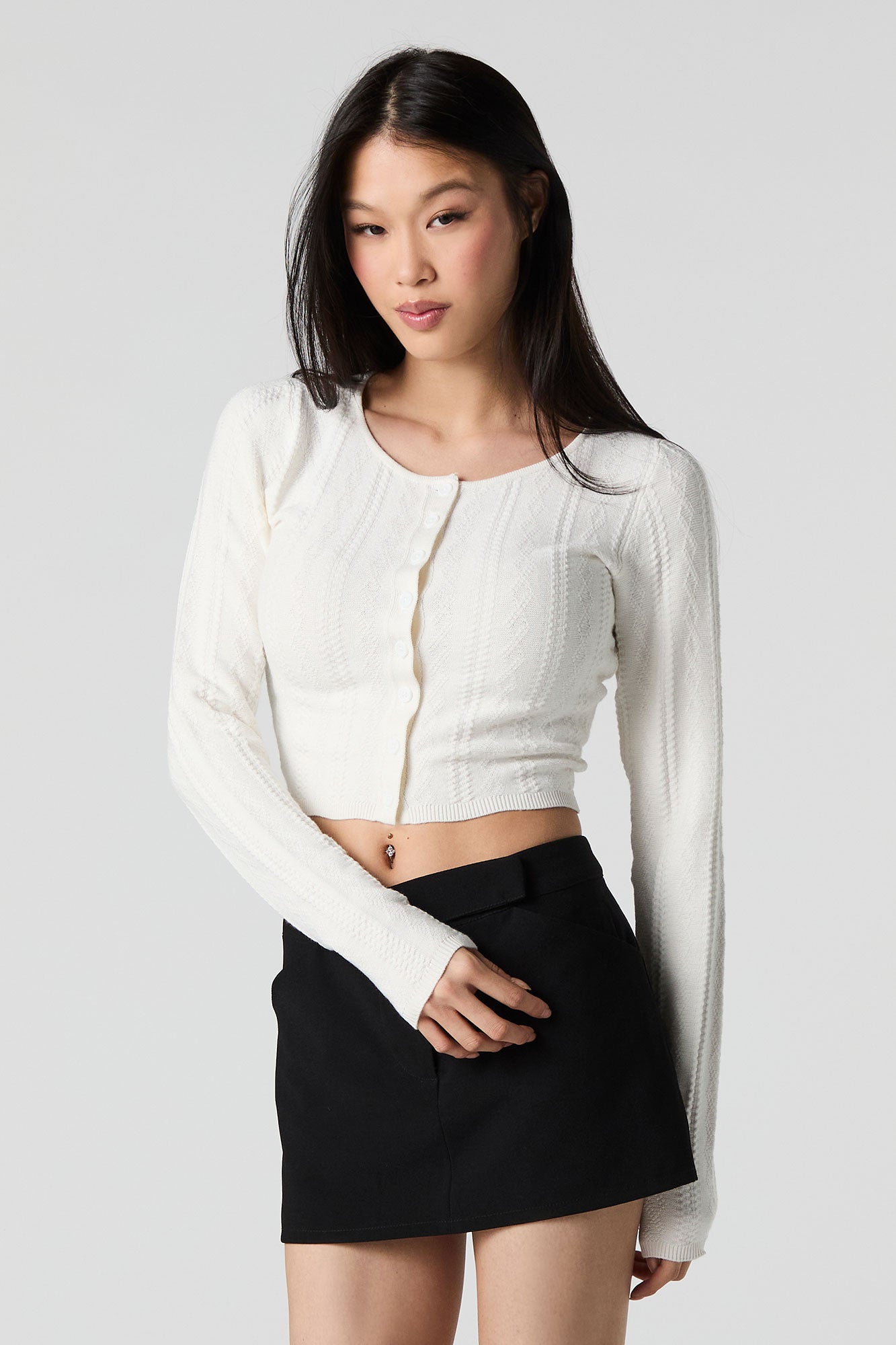 Textured Pointelle Knit Cropped Cardigan